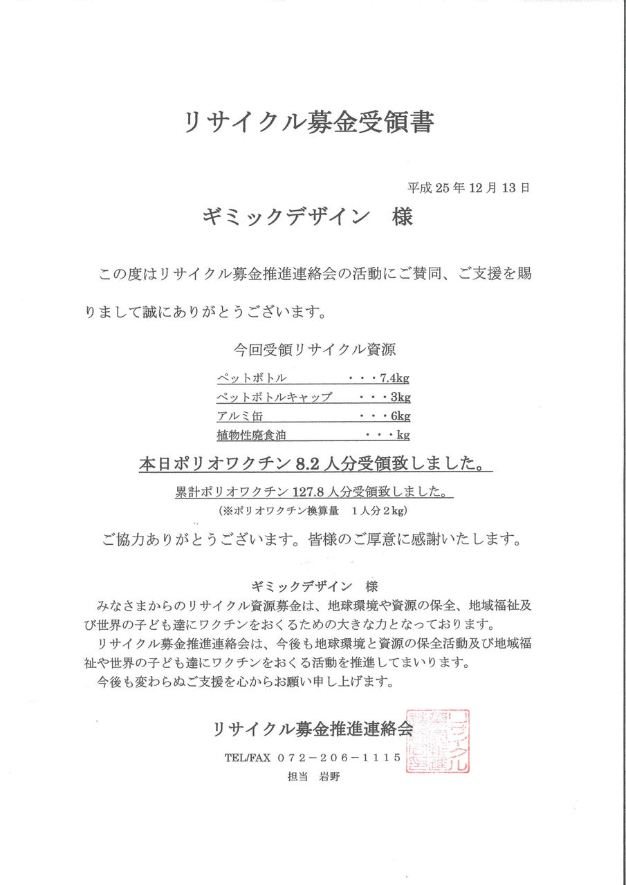 私達の小さな活動が少しでも皆さんに役立ってくれればうれしいので 続けてまいりました。今日は 前回の報告した後の受領書が届いたので 資源募金活動の報告をします。
